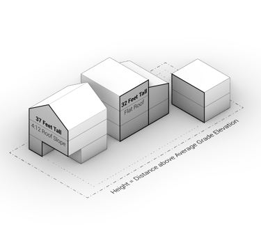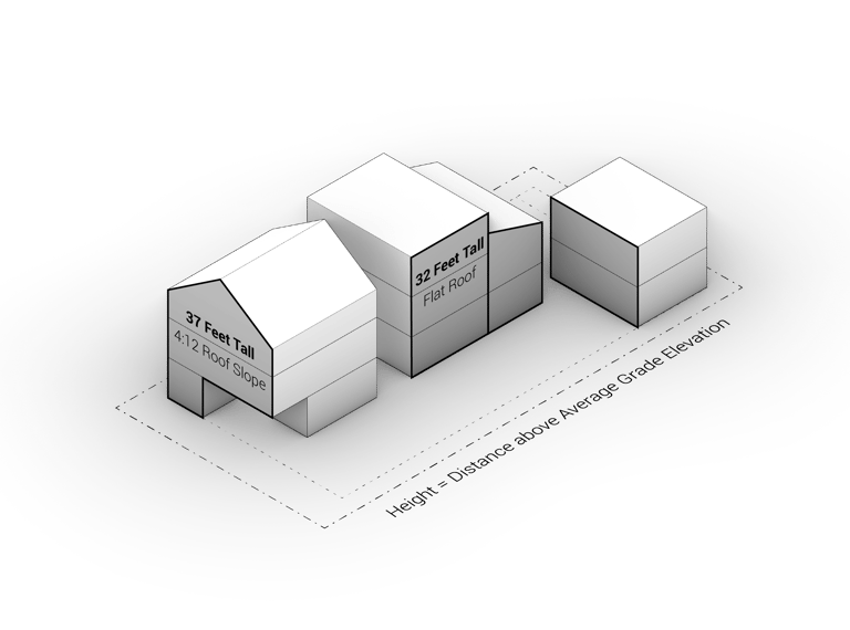 The ridge of a pitched roof can extend 5 feet above the maximum height limit within a 4:12 sloped envelope. Shed and butterfly roofs cannot extend above the maximum height limit.